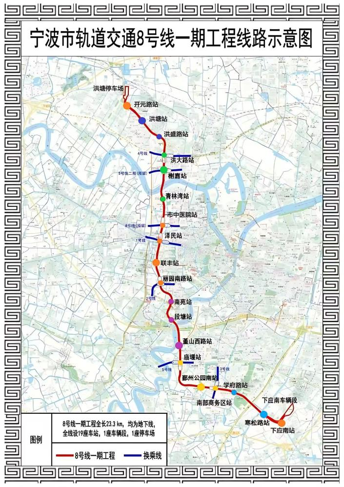 宁波轨道交通8 号线一期工程全长约 23.3公里,作为城市轨道交通主干线路,承担串联城市东南与西北片区的功能 —— 线路起于鄞州下应片区寒松路站,止于江北洪塘片区开元路站,与1-5号线及未来建成的6号线均设有换乘。该线路的开通,有效优化了中心城区交通结构,为市民提供了便捷、高效、低碳的出行选择,强化了城市各区域间的联动性,对优化城市空间布局、推动绿色低碳城市建设具有重要意义。