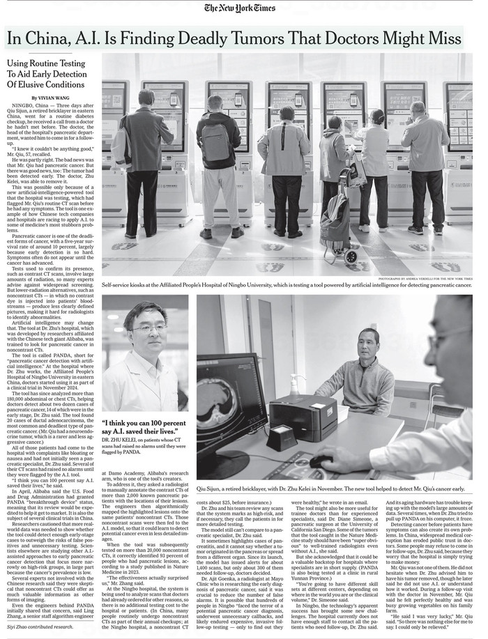 据悉,这是纽约时报2026年首篇关于中国的报道,英文标题为InChina,A.I.IsFindingDeadlyTumorsThatDoctorsMightMiss,中文标题为《“AI救了他的命”:中国医生借助人工智能识别胰腺癌》。