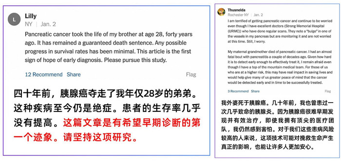 一些被胰腺癌夺走亲朋好友的美国民众,则真情实感地期盼能用上中国AI,并鼓励中国AI研究人员:“这项研究能让许多人安心”“请坚持这项研究”。